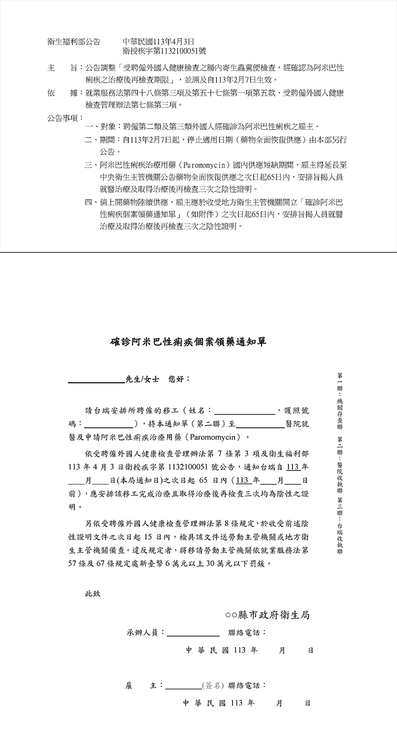 衛生福利部公告:公告調整「受聘僱外國人健康檢查之腸內寄生蟲糞便檢查,經確認為阿米巴性痢疾之治療後再檢查期限」,自113年2月7日生效